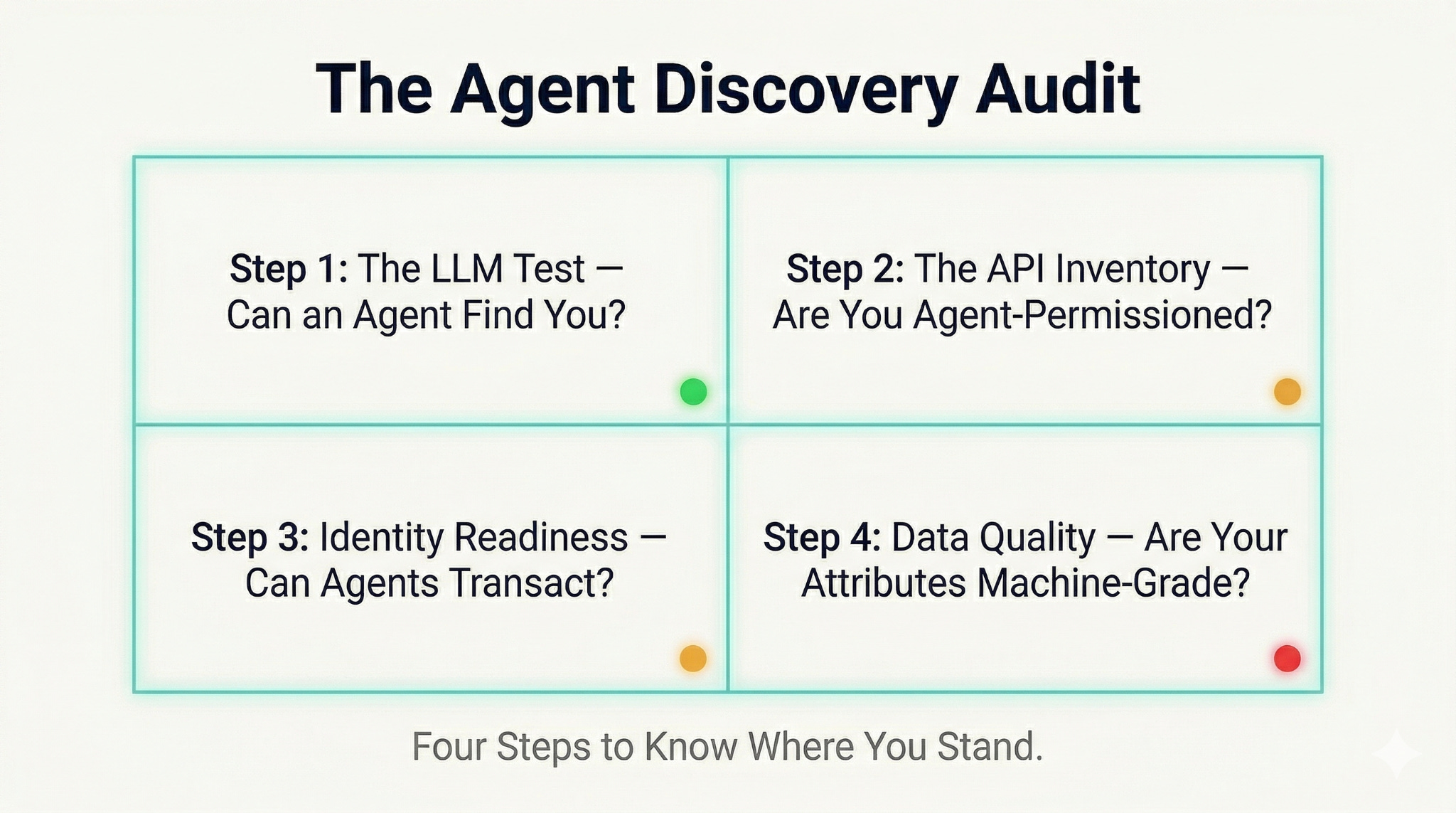 Before we talk more about the Agent Discovery Audit, I just want to clarify what this audit is and isn’t. It’s not a comprehensive digital transformation roadmap. It won’t fix your data architecture in a week. What it will do is give you a clear, honest picture of your current agent-readiness across four dimensions and tell you which one to prioritise first.