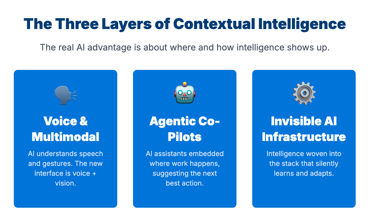 The third layer is the least visible and the most powerful: intelligence in the foundational pillars. No prompts. No UI. Just systems that learn and adapt, shifting from rules-based to signal-based execution.
